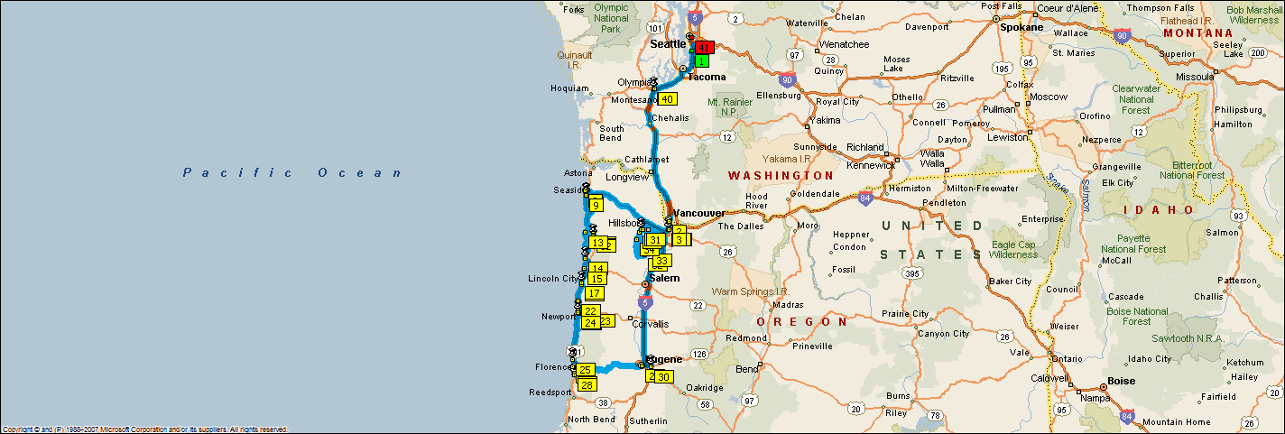 | 4:54 PM | 307.1 | Turn LEFT (South-West) onto Cape Meares Loop for 2.5 mi |